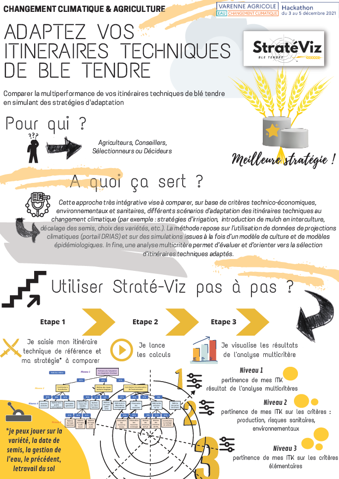 Destiné à différents acteurs du monde agricole, agriculteurs, conseillers, sélectionneurs et décideurs politiques, STRATÉ-VIZ permet de réaliser des face-à-face entre 2 stratégies d’adaptation d’itinéraires techniques de blé. Après avoir saisi ses 2 itinéraires techniques, l’utilisateur peut visualiser sous format graphique (radar, podium), la stratégie conduisant à la meilleure multi-performance technico-économique et environnementale. La visualisation sous format radar permet de comparer les stratégies à l’échelle de critères élémentaires ou agrégés.